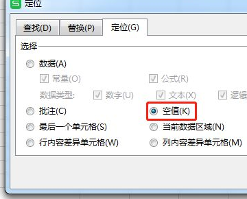 3、然后在打开的定位选项中,勾选空值,点击定位,如下图所示。