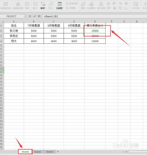 然后,我们切换回Sheet2工作表,就会发现B2单元格已经关联了Sheet1的E2单元格,我们按“Enter”进行确定:
