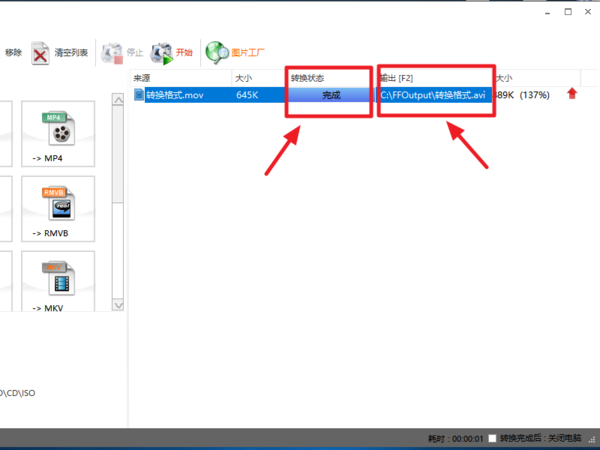 6、转换完成后,转换进度里面显示完成,转换成功,在输出栏可以看到视频转换后保存的路径,整个操作完成。
