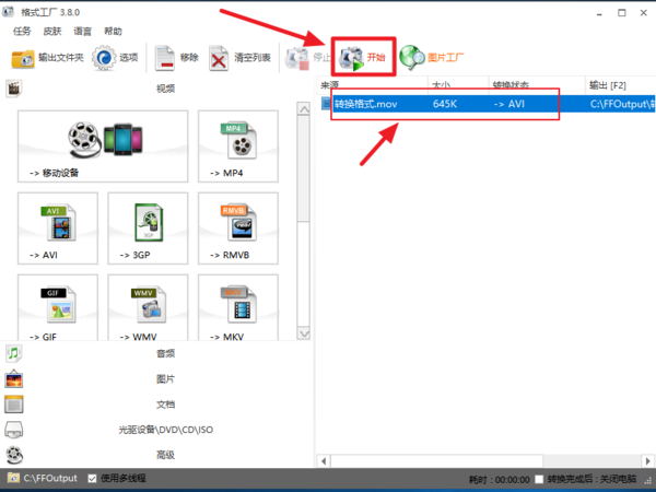 5、选中待转换的视频,点击开始按钮,视频开始进行转换,下方状态栏可以查看转换的进度;