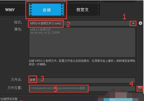 8、弹出的窗口中,点击倒三角,里面有四种音频格式,可以任意选一种格式,这里选MPEG-4音频文件单击,然后起一个文件名,再点开黄色文件夹,找一个保存的位置,这里暂时保存到桌面,启用智能渲染前面打勾,最后单击开始,如图所示。
