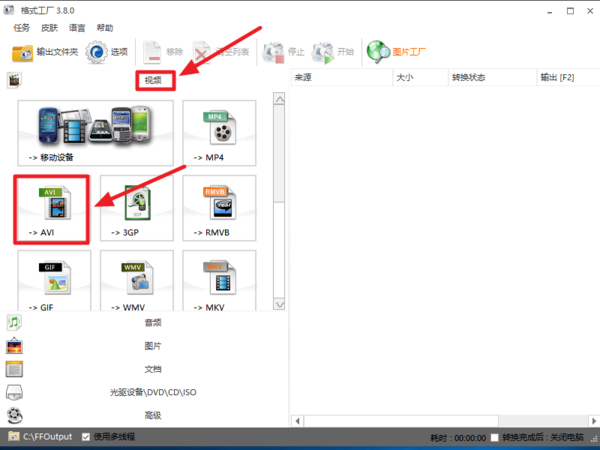 2、打开格式工厂软件后,展开左边的视频菜单,在功能列表中找到转AVI视频的功能图标,点击转AVI视频功能图标;
