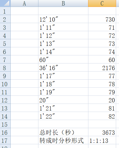 然后直接用sum()函数即可求出以秒为单位的总时长(本例为C16)。