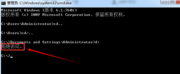 这个问题跟权限没有任何关系。 出现错误,是因为你的命令输入错误。 首先,CD命令后面,必须有空格,而不是〉符号。 其次,D盘的文件夹,也就是目录,其路径应该是D:\vc6,中间必须有个\符号,路径加深同理。 所以你的正确命令应该是 cd D:\vc6 ,回车即可正常进入目录。cmd拒绝访问怎么提权