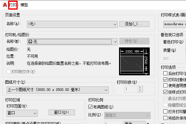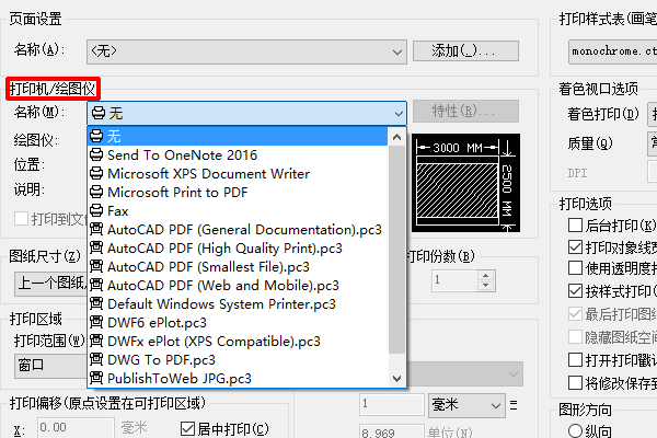 4、在打印选项中找到“打印机/绘图仪”弹出下拉菜单。