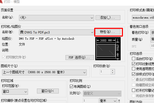 3.在“打印”弹窗中,我们选择打印机名称为“dwg to pdf.pc3”,点击右侧“属性”,再点击“自定义特征”。
