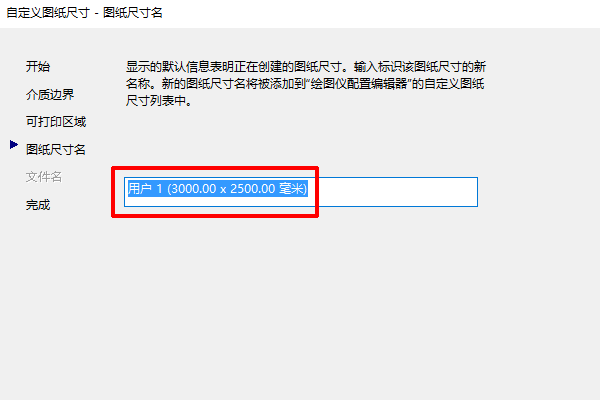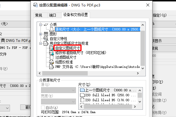 7、在弹出的“绘图仪配置编辑器”中找到“自定义图纸尺寸”。