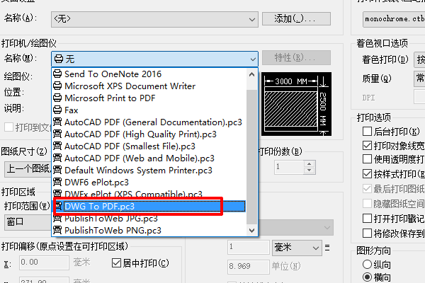 5、在下拉菜单中选择“DWG to PDF.PC3”。
