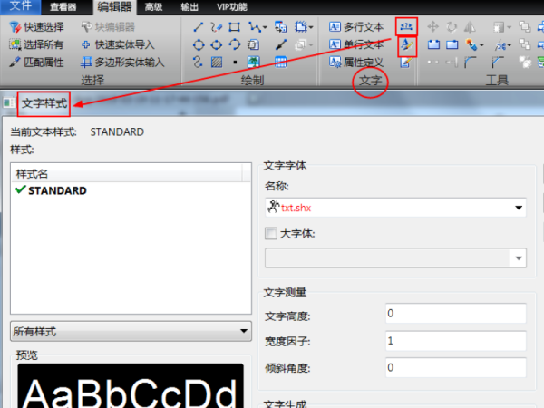 2.点击软件菜单栏上的“编辑器”按钮,会出现很多功能操作图标,我们选择“文字”功能,可以用里面的“单行文本”、“多行文本”、“属性定义”进行操作。点击“文字样式”,可以添加和删除文字样式。