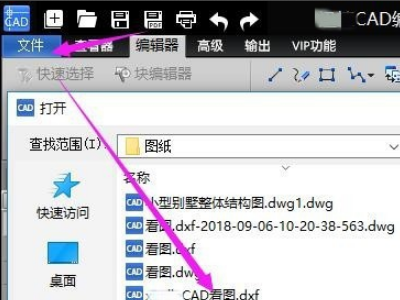 2、操作运行软件,点击界面上方“文件”按钮,再点击“打开”按钮,在弹出的窗口里面找到需要操作图纸文件,点击“打开”。如下图: