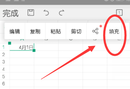 3、然后长按A1单元格,即可弹出选项菜单,点击菜单右侧的“填充”选项。