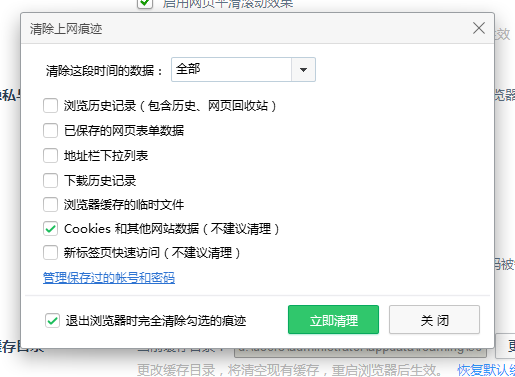 360浏览器有项功能是退出浏览器完全清理勾选的痕迹,该功能如果同时勾选了清理cookies选项就不会保存登录网站的账户,修正方法如下: