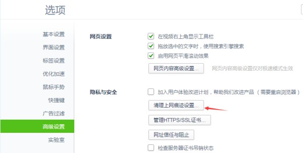 2、左侧导航栏点击高级设置,右侧点击清理上网痕迹设置按钮;