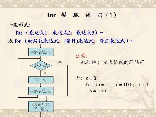 for(循环变量赋初值;循环条件;循环变量增值)语句 如 for(i=1;i<=100;i++)sum=sum+i; 它的执行相当于 i=1; while(i<=100){ sum=sum+i; i++; } 显然,用for语句更简单、方便。c语言中for语句的用法及规则是什么?