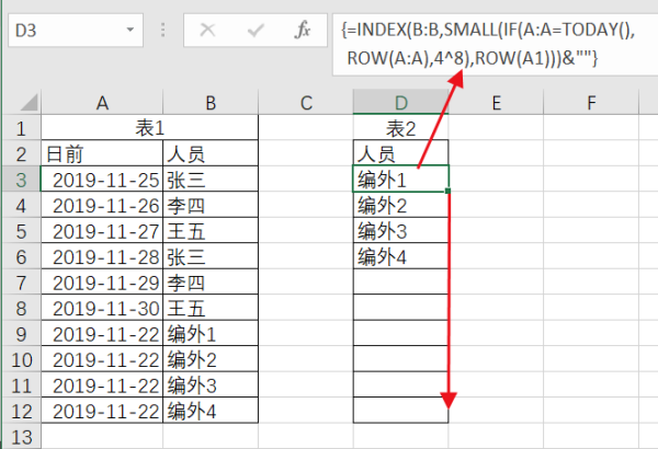 可以,楼主只需要把下面的日期填满就行了。 比如 a b 1月2日 内容1 1月2日 内容2 1月3日 内容3 这样就可以了,你筛选的时候b列就会出现所有的内容表一两列,分别为日期和人名,求一个EXCEL公式,如果A列一个单元格的日期等于今天,则提取B列对应人名到?