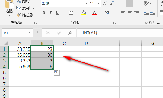 3、输入公式=INT(A1)后,按回车键就可以去掉小数点后面的数字了。