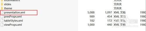 而后你就会看到以下的目录中,找到一个名为“presentation.xml”的文件,双击编辑它。