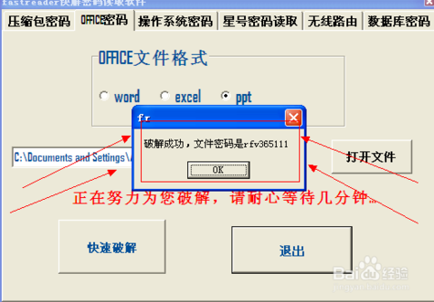 1.当我们打开一个PPT文件时,会看到一个输入密码的提示框,这时,我们可以借助快解密码读取工具(FastReader)来提取PPT中的密码。 2.下载解密码读取工具(FastReader)后打开 3.切换到“OFFICE密码”选项卡,在“OFFICE文件格式”中选择“PPT 4.点击“打开文件”,打开所要破解密码的PPT文件 5.点击“快速破解”,大约3分钟左右,我们就可以得到PPT文件的密码了 6.这时,我们将密码输入到加密的PPT文件中,就可以打开文件了忘记ppt密码了怎么办