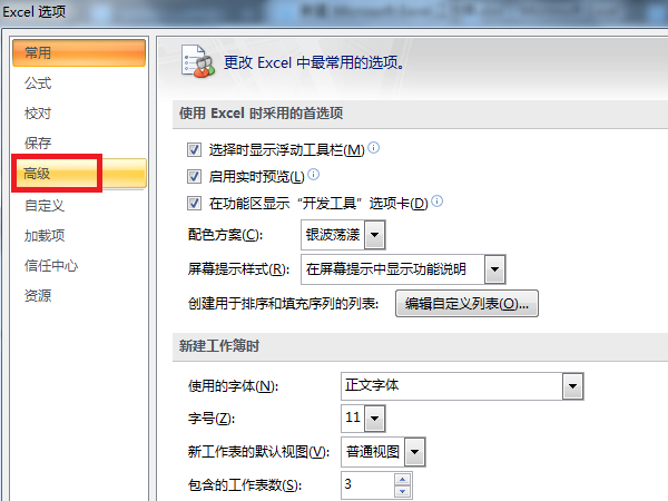 6、进入excel选项界面后,点击“高级”选项。