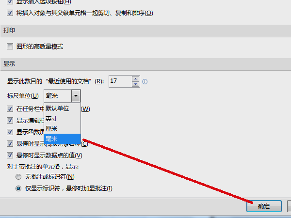 5、如果要以毫米为单位,需要先进入excel选项界面修改默认单位。