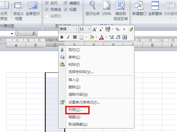 3、然后用鼠标右击某一列,在其菜单中点击“列宽”选项。