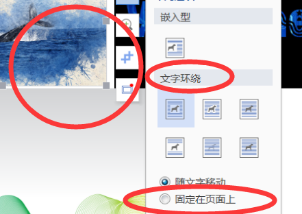 3、点击图片右上角的布局选项,并选择文字环绕的样式,同时需要点击选中“固定在页面上”。