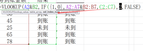 5、=VLOOKUP(A2&B2,IF({1,0},A2:A7&B2:B7,C2:C7),2,FALSE)公式中2表示返回查找区域第二列(就是c列)的数值。