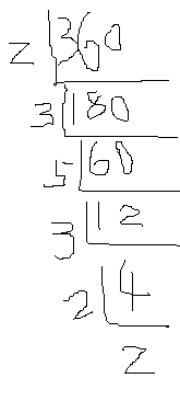 360/1=360.360/2=180.180/2=90,90/2=45.这时候2不能整除了,从3开始,以此类推可以得出,360=1*2*2*2*3*3*5.