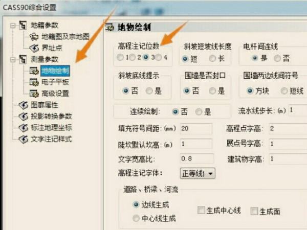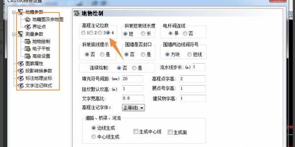 2、下一步弹出新的页面,需要找到地物绘制并根据实际情况设置高程注记位数。