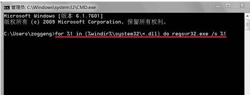 开始 - 运行(输入CMD)- 打开管理员命令窗口,在命令窗口输入:for %1 in (%windir%\system32\*.dll) do regsvr32.exe /s %1,回车,到屏幕滚动停止为止。