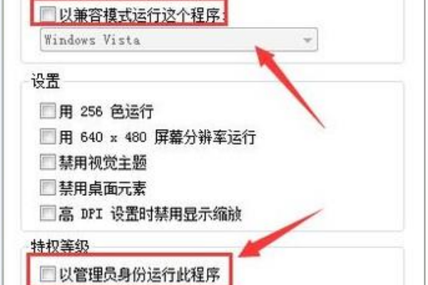 2.点击该属性在弹出对话框中找到兼容性选项,点击管理员身份运行。