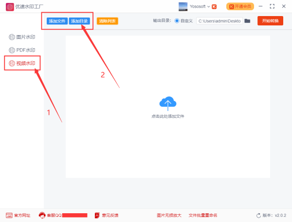 步骤1,下载工具后安装打开,选择左边的【视频水印】功能后,再点击左上角的【添加文件】按钮,将视频导入到软件中,可以同时添加多个视频批量加水印。