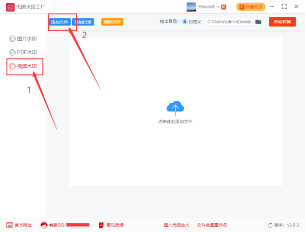 步骤1,打开工具,选择左边的【视频水印】功能后,再点击左上角的【添加文件】按钮,将视频导入到软件中,可以同时添加多个视频批量加水印。