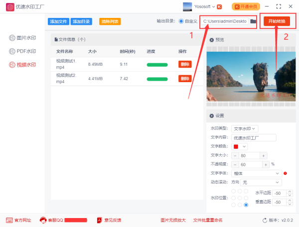 步骤3,最后设置输出目录(也就是保存位置),点击【开始转换】按钮,启动软件程序。所有视频添加水印成功后,软件会自动打开视频的输出文件夹。