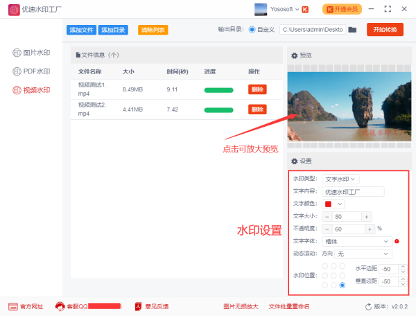 步骤2,导入完视频就是设置环节了,如下图所示软件右下方,水印类型选择“文字水印”,在下方输入文字内容;然后设置文字水印的颜色/大小/透明度/字体/位置等参数,还可以设置文字水印成动态的。在上面可以预览水印的样式,点击可以放大预览。