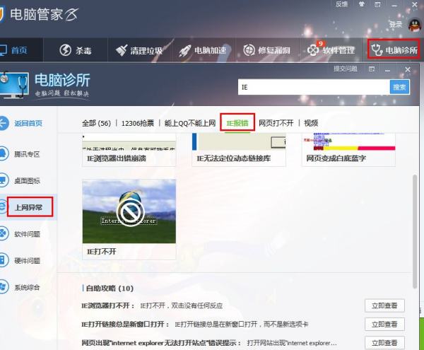 其次,IE异常,也可以用腾讯电脑管家修复下