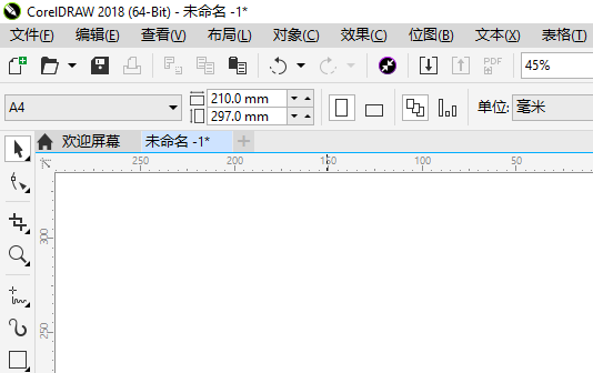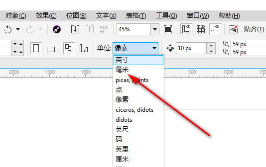 2、打开coreldraw后,在选择工具页面,上方工具栏中把单位下拉然后选择毫米。
