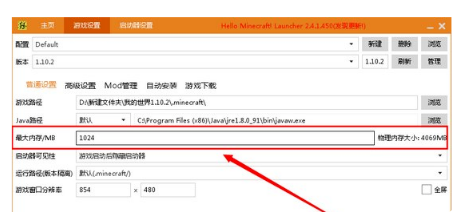 3.把内存设置修改成合适的大小(可尝试512、1024、2048进行切换)。