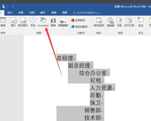 2、全部选中word文档内容后点击CTRL+C复制,然后点击插入-smartart。