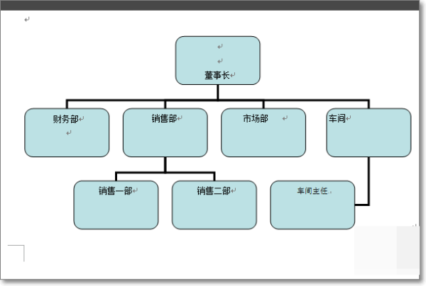 5、选中市场部,再加入个同事车间,在插入车间主任;选中销售部,分为销售一部和销售二部。
