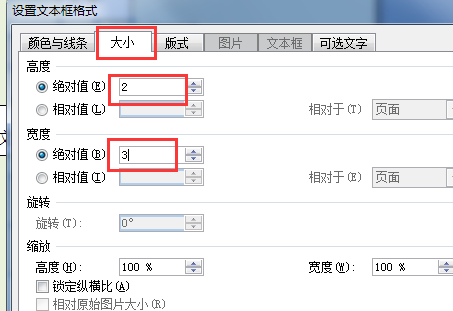 5、随后,在弹出窗口中点击大小选项卡,设置文本框的高度和宽度,之后单击“确定”按钮,如下图所示,然后进入下一步。