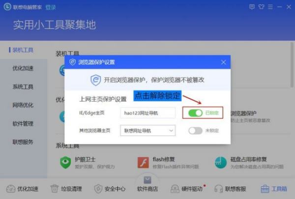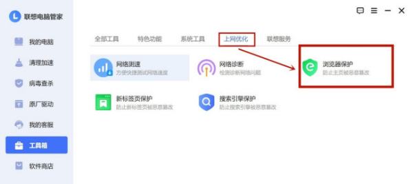 1.打开,联想电脑管家-选择“工具箱”-“上网优化”找到“浏览器保护”,如图: