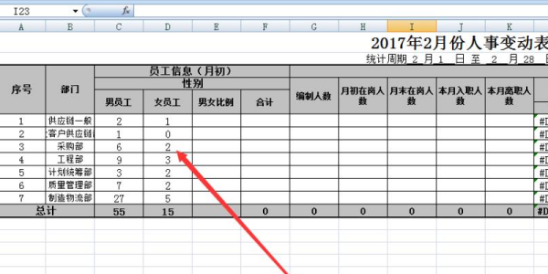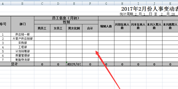 1、新建一个表格,把基本信息先制作好,此处我们以不同步部门的男女比例为例子,进行展示。