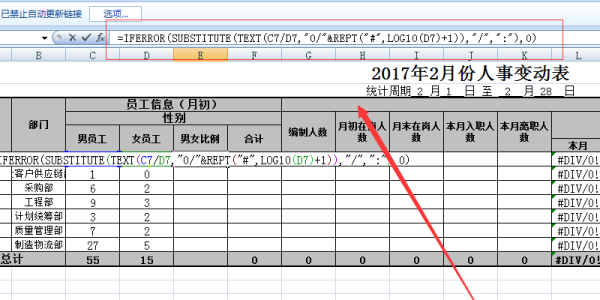 7、再选中这个单元,下拉就可以直接复制公式,这样每个部门的男女比例就能显示出来了。