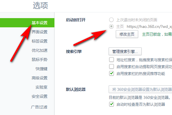 4、进入到选项里面之后,点击基本设置,在启动时打开主页,并将360浏览器的主页网址输入去即可。