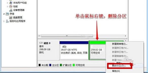 6、然后在可用空间单击鼠标右键,选择“删除分区”