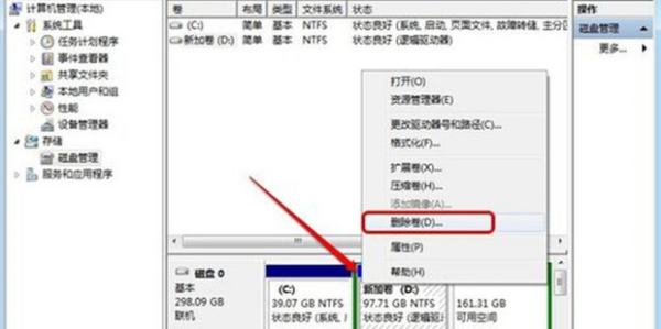 3、鼠标右键单击和c盘相邻的d盘,在弹出的菜单里面点击删除卷按钮。