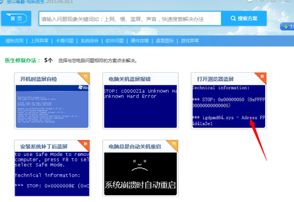 该问题可以通过杀毒软件自带的蓝屏修复功能进行修复。