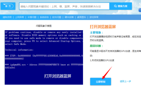 2.选择“打开浏览器蓝屏“,点击立即修复后,电脑医生就会自动修复蓝屏故障。