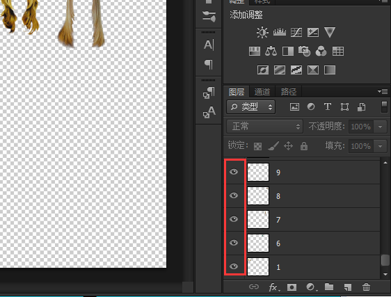 二、 如下图,这样滑动过的图层小眼睛就都会被点亮,这些图层就会显示,但是若是图层几十层,甚至上百层用这个办法就有点杯水车薪了。